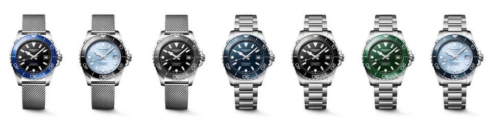 3月末の発売より世界的に人気を集める「ハイドロコンクエスト」は、39mmと42mmの2サイズで、ミラネーゼメッシュブレスレットは、ルミナスブルーのベゼル×ブラックダイアル、ブラックベゼル×フロステッドブルーダイアル、スレートグレーベゼル×ブラックダイアル、Hリンクブレスレットはブルーベゼル×ブルーダイアル、ブラックダイアル×ブラックベゼル、グリーンダイアル×ヴァーダントグリーンベゼル、ブルーベゼル×フロステッドブルーダイアル(直営店限定)を展開。「ロンジン アーカイブ展 ポップアップストア」では、そのすべてが揃います。