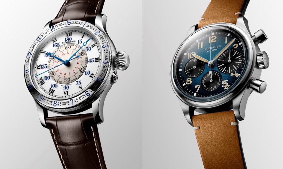 左)ロンジン リンドバーグ アワーアングル ウォッチ L2.678.4.11.0 ¥853,600/右)ロンジン アヴィゲーション ビッグアイ L2.816.1.93.2 ¥603,900