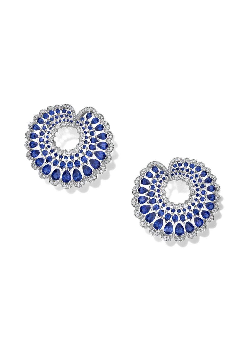 Ref. 840656-1004 – 18Kエシカルホワイトゴールド製イヤリング、ペアシェイプ(7.24カラット)とブリリアントカット(1.34カラット)サファイア、ブリリアントカットダイヤモンド(0.83カラット)をセット。