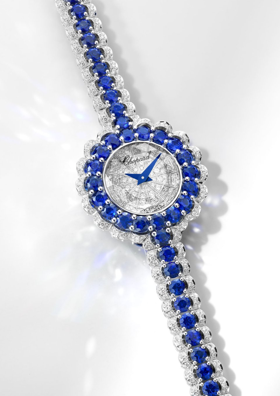 最初に紹介するのは、「プレシャス レース」の美学をウォッチメイキングの世界へともたらしたタイムピース。サファイアとダイヤモンドが全面にセットされ、文字盤を囲むブルーのプレシャスストーンがヘイロー(光輪)を描き出しています。カットダイヤモンドのフォルムを想起させるファセット加工を施したサファイアクリスタルが、インプレッションをさらに増幅させ、手首の動きに合わせて眩い光を放ちます。1,000石以上ものプレシャスストーンからなる輝きをまとい、“時を告げる真のジュエリー”であると同時に、軽やかさとエレガンスを詩的に体現しています。