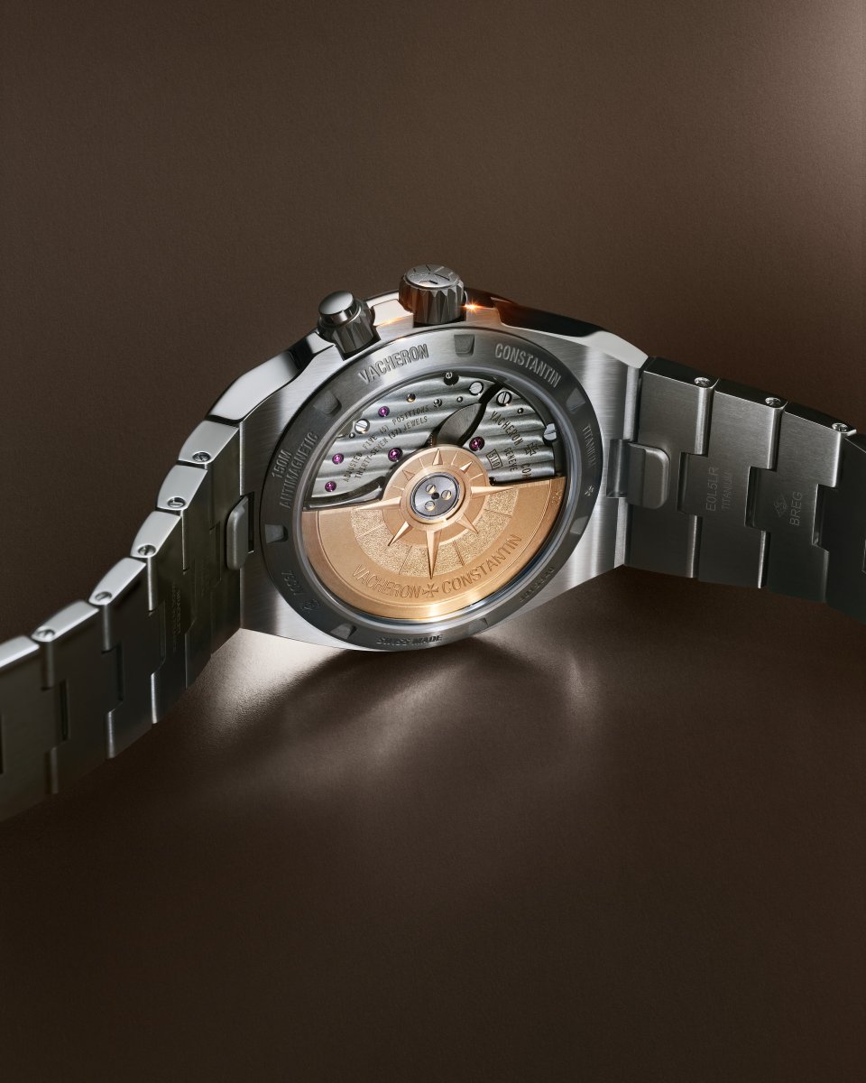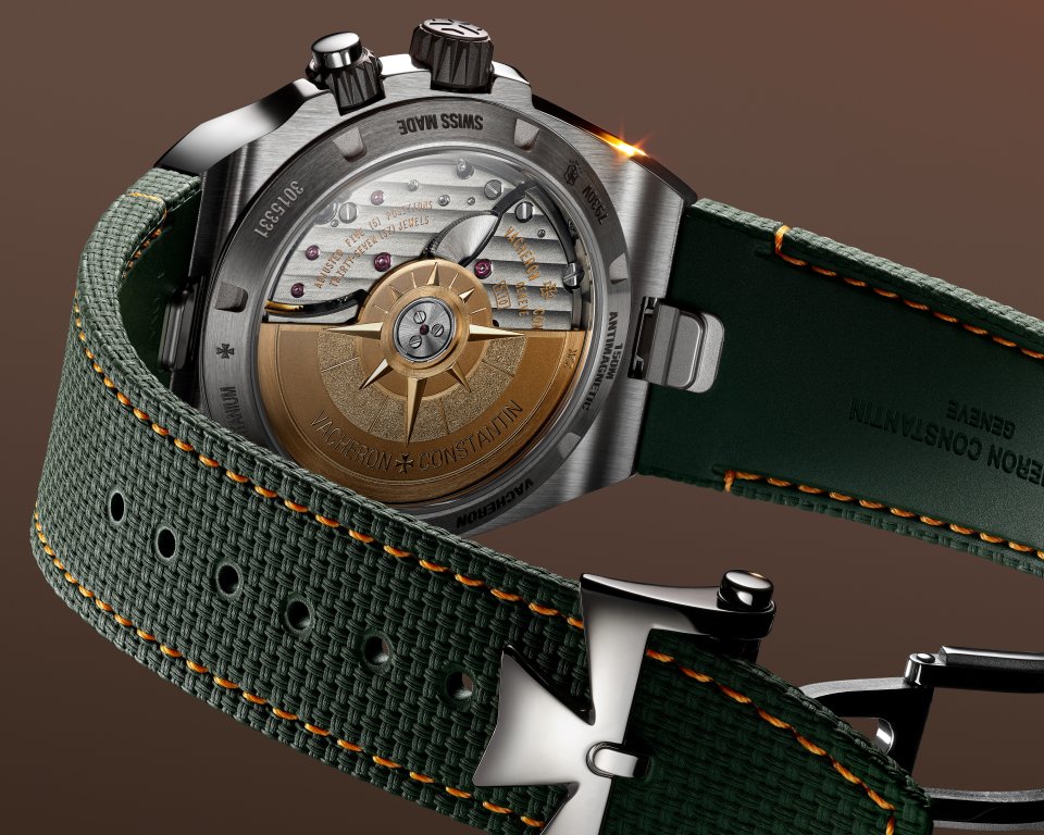 受けに施したダークグレーのNAC処理は、チタン製ケースの色合いと調和し、外から見える輪列の部品や「オーヴァーシーズ」の象徴的な方位図をあしらったイエローゴールド製ローターとの対比を生み出します。