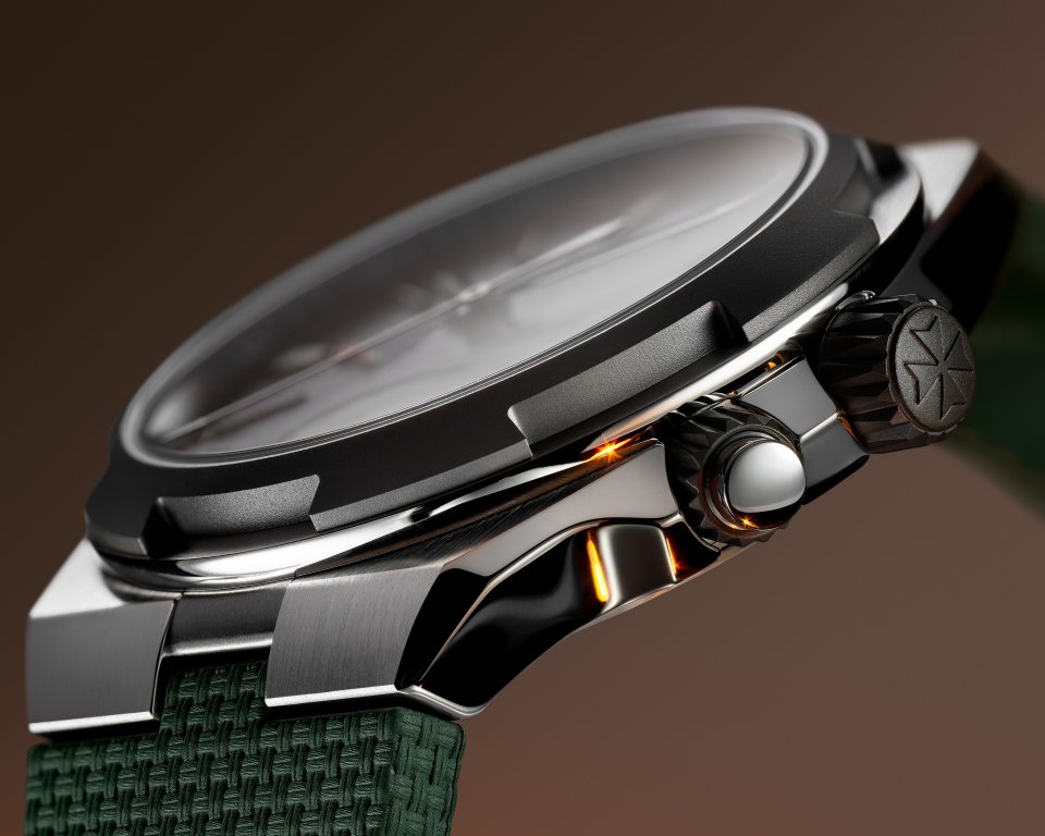チタン特有の美しさと高い機能性を、ベゼル、リュウズ、プッシュボタンリングのマットなアンスラサイトグレー仕上げが引き立てています。その繊細なコントラストが、「オーヴァーシーズ」を象徴するベゼルに施されたマルタ十字を想起させる切り欠きを際立たせています。