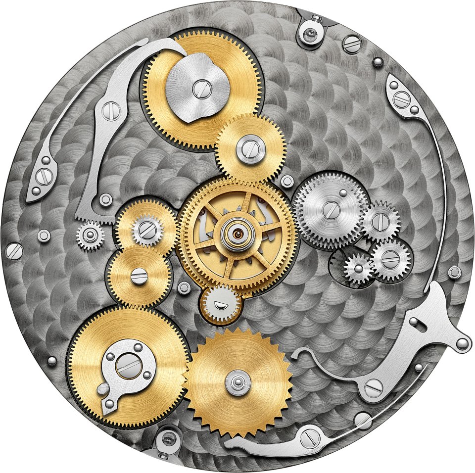 仕上げの中でも特筆に値するのが、地板の全体に施したペルラージュ仕上げです。仕上げはムーブメントをケースに収めた後は見ることのできない裏面にまで施され、完璧さと隠れた美を追い求める揺るぎない姿勢を物語っています。