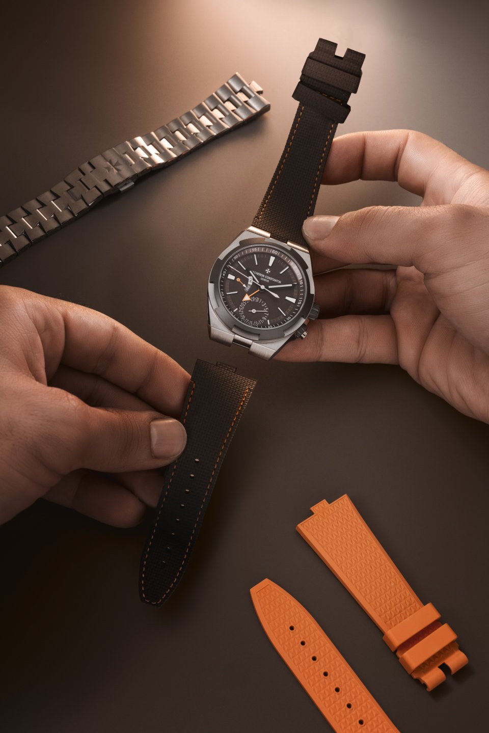 1本はオレンジのラバーにマルタ十字に着想を得た質感が、もう1本はダイヤルカラーと同じ色合いのラバーに質感のある模様があしらわれています。