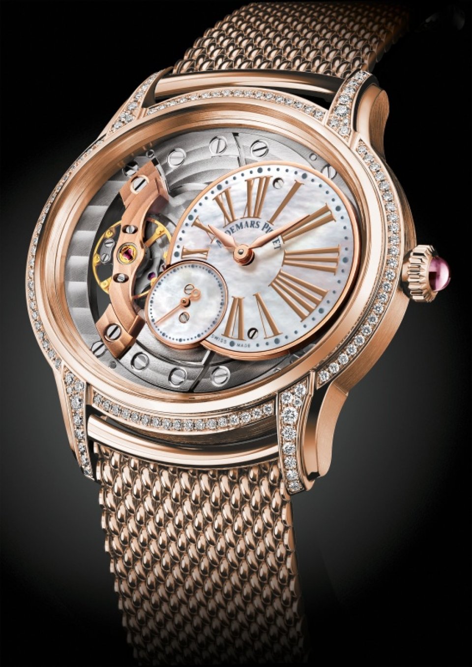 反射防止加工サファイアクリスタルガラス製風防とケースバック、ダイヤモンドがセッティングされたベゼルとラグ、ピンクサファイアのカボションセットのリューズ、2気圧防水