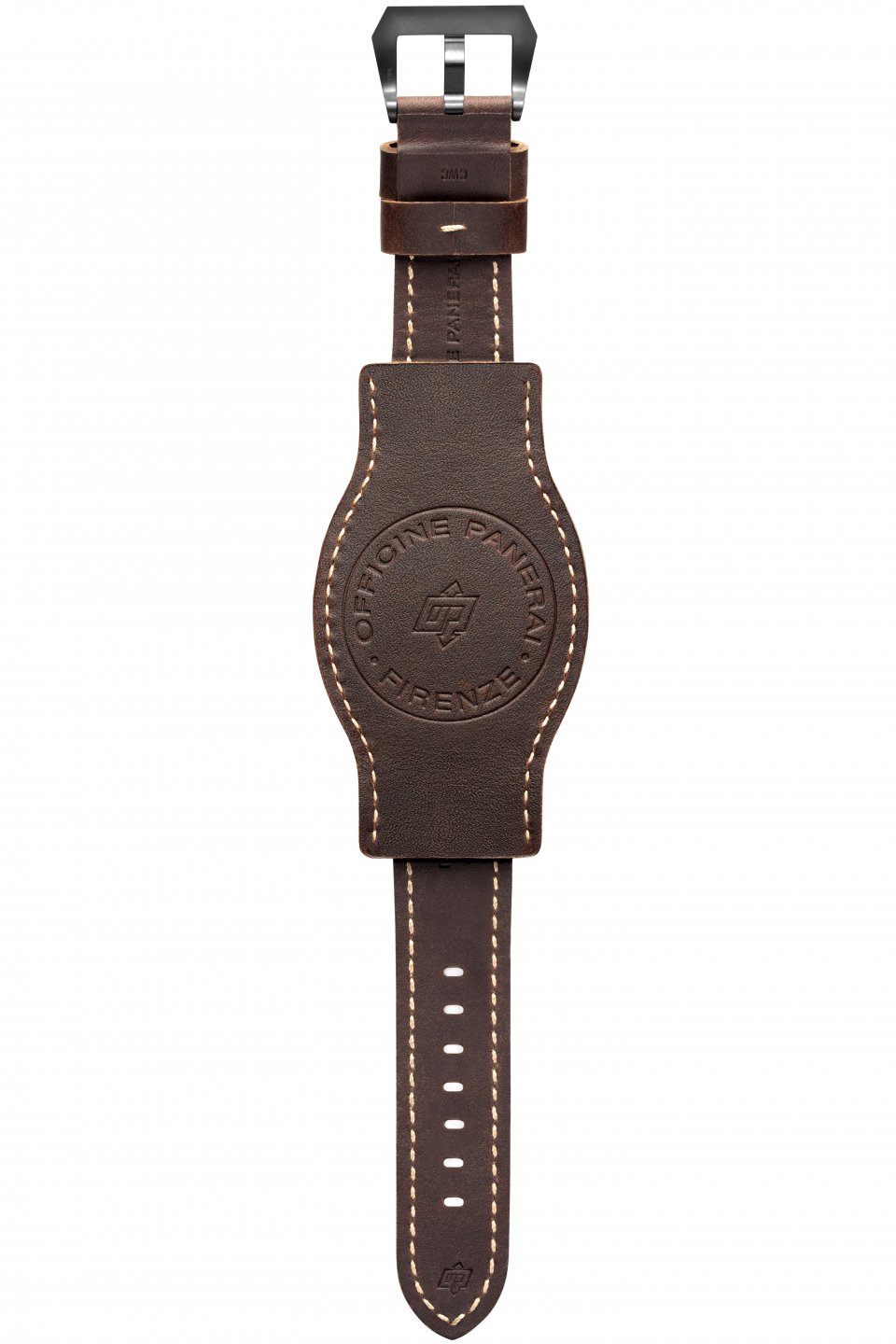 カフストラップは、もともとミリタリー用にデザインされたもので、時計のケースバックが直接肌に触れるのを防ぎます。この時計は、カフストラップでも、カフをはずしてストラップだけでも使用することができます。いずれもベージュのステッチが施され、OPロゴがホットスタンピングされており、DLCコーティングされたバックルにマッチします。ボックスにはブラックのラバーストラップも収められています。