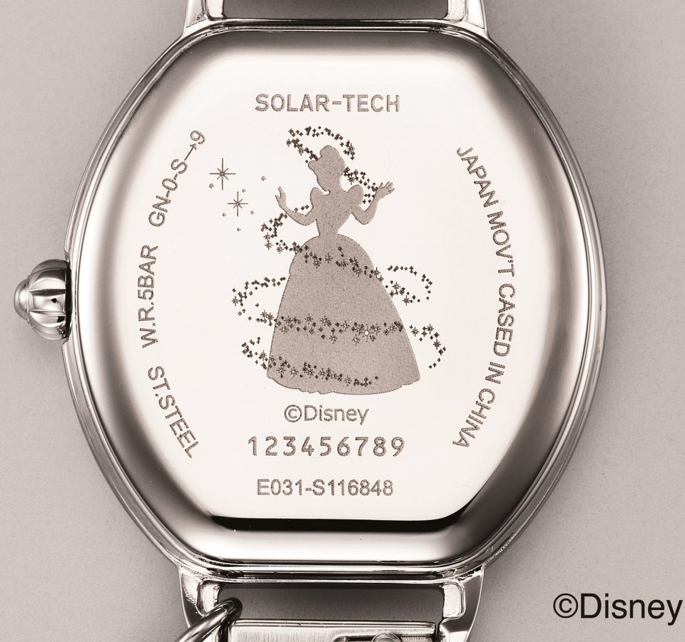 そして、魔法が解ける直前の11 時59 分にはガラスの靴をイメージしたスワロフスキー®・クリスタルをセットしました。裏ぶたには、シンデレラが魔法にかかる瞬間のシルエットを刻印しています。