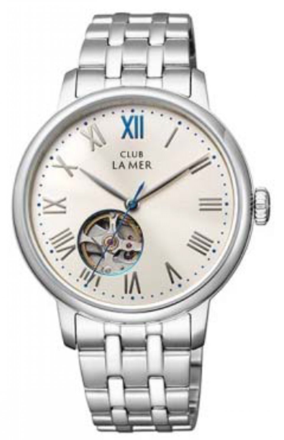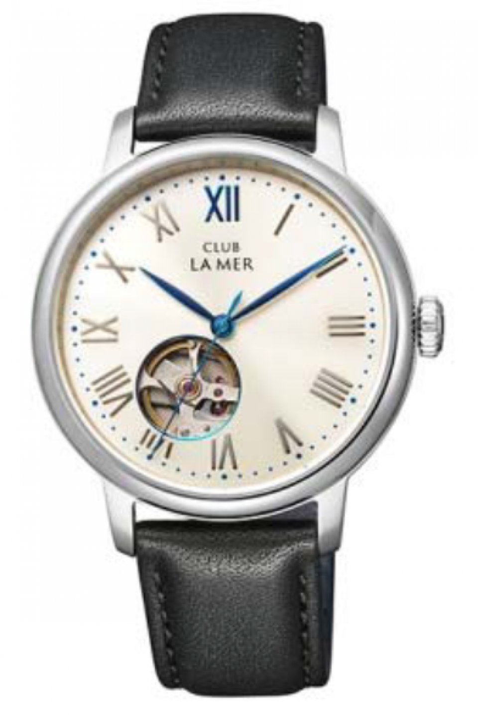 クラブ・ラ・メールの伝統にもとづいたトラッドなデザインと機械式時計を存分に楽しめる構造が特長です。エンボス加工*のインデックスに、丸みを帯びたリーフデザインの針がアンティーク感を引き立てます。文字板7 時位置のブルーカラーの縁取りが施されたオープンハートの小窓からは、時計のメカニカルな動きを楽しむことができます。また、シースルーバックになった裏ぶたからは伝統的なストライプ模様が美しいコート・ド・ジュネーブ装飾が施された機械式ムーブメントを眺めることができます。ケースサイズは38mm なので、男女問わずお使いいただけます。