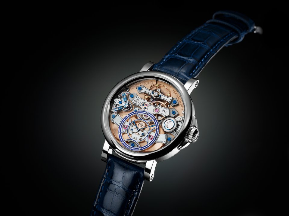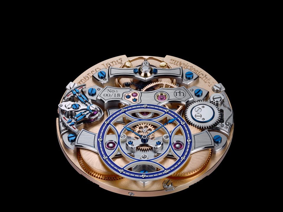 直列に配置された2つの香箱により、ムーブメントのパワーリザーブがより長くなり、その一方美的には、大型のシングルバレルが醸し出す重圧感からは解放されるということができます。追加された2つの針は、スケルトン化された半透明のエナメルダイアル上に時間と分を表示します。そして最後にマスターは、色の遊びを表現します。ローズゴールド・プレイトのベースプレイト上にハードゴールド合金製の歯車、ポリッシュ、ブラッシュあるいはブルーの焼き入れをしたスティール、ルビーを配置、トップには自銘をエングレーブしました。