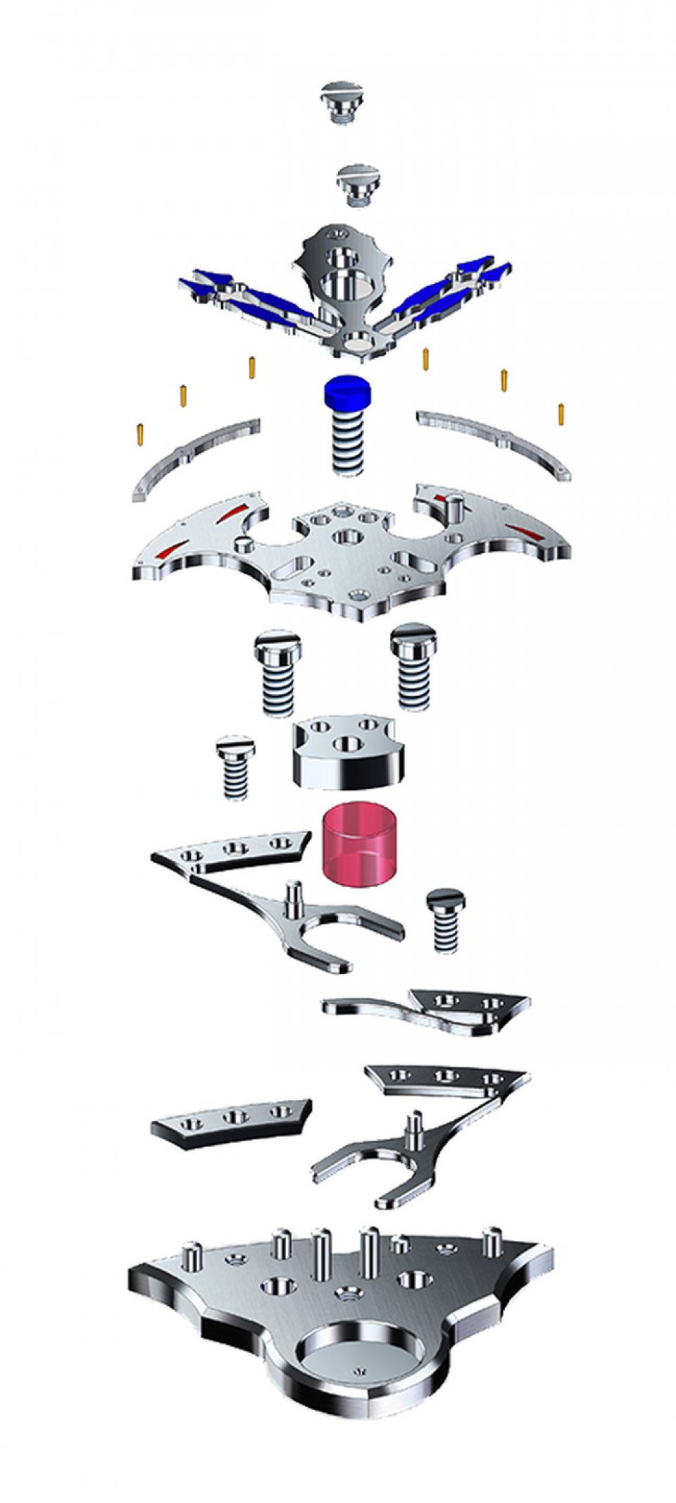 この非常に小型化されたメカニズムは、リューズの反対側に配置されており、美しいコウモリ型のブリッジとのハイライトを演出しています。