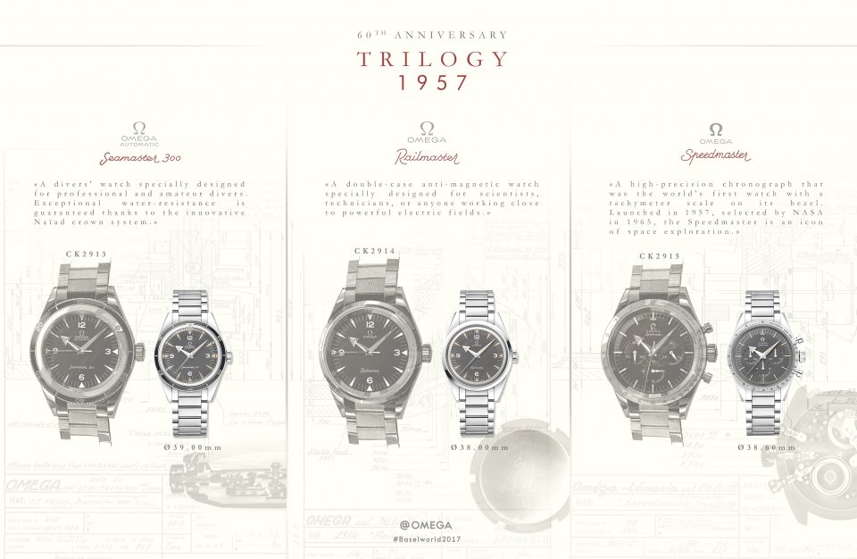 From : OMEGA (オメガ )後に歴史的な年となる 1957 年に、オメガは完璧なクラシックタイムピースとしてその名を轟かせるプロ 仕様の 3 つのモデル、シーマスター 300、レイルマスター、スピードマスターを発表しました。誕生 60 周年となる今年、この 3 つのマスターピースをたたえ、それぞれの 60 年周年記念モデルを発表します。 各モデルは個別に発売するほか、3 モデルが特別ボックスに入ったセットも登場します。