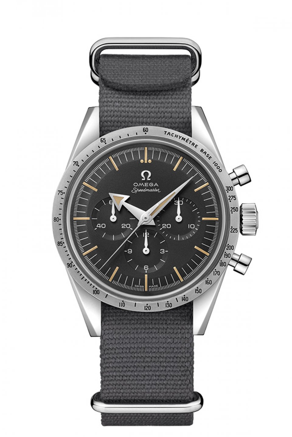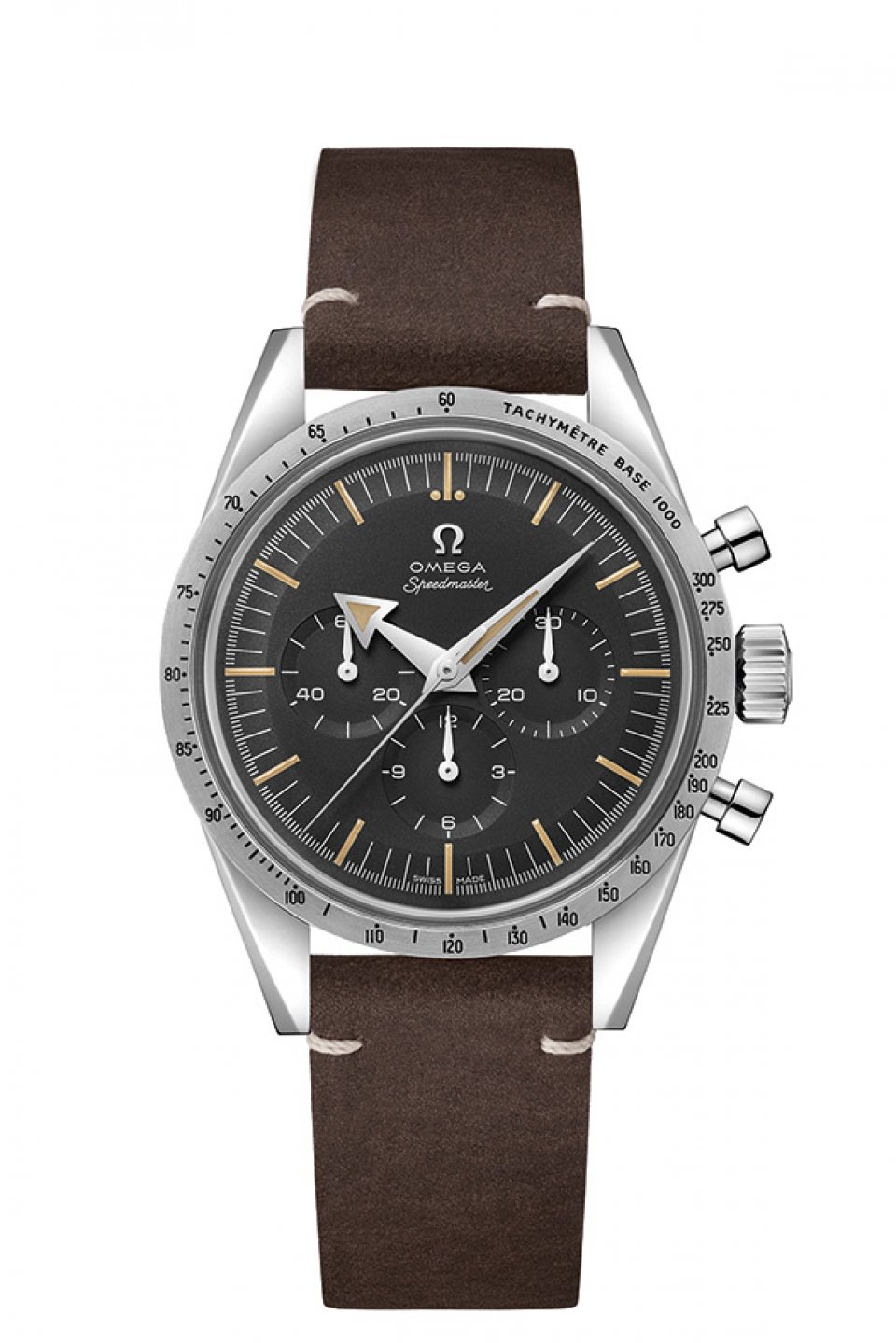 針の形から“ブロードアロー”と呼ばれていたスピードマスターのオリジナル版は、スピードマスターの 第 1 号であるだけでなく、ベゼルにタキメータースケールをつけた世界初のクロノグラフ腕時計でもあり ました。タキメーターをダイアルに置かなかったのは、レーシングドライバーが視認しやすいデザインに するためだったのです。今回の新しいモデルでは、1957 年のオリジナルタキメータースケールに合うよう に書体を描き直しました。腕時計の心臓部にはキャリバー1861 を搭載しています。
