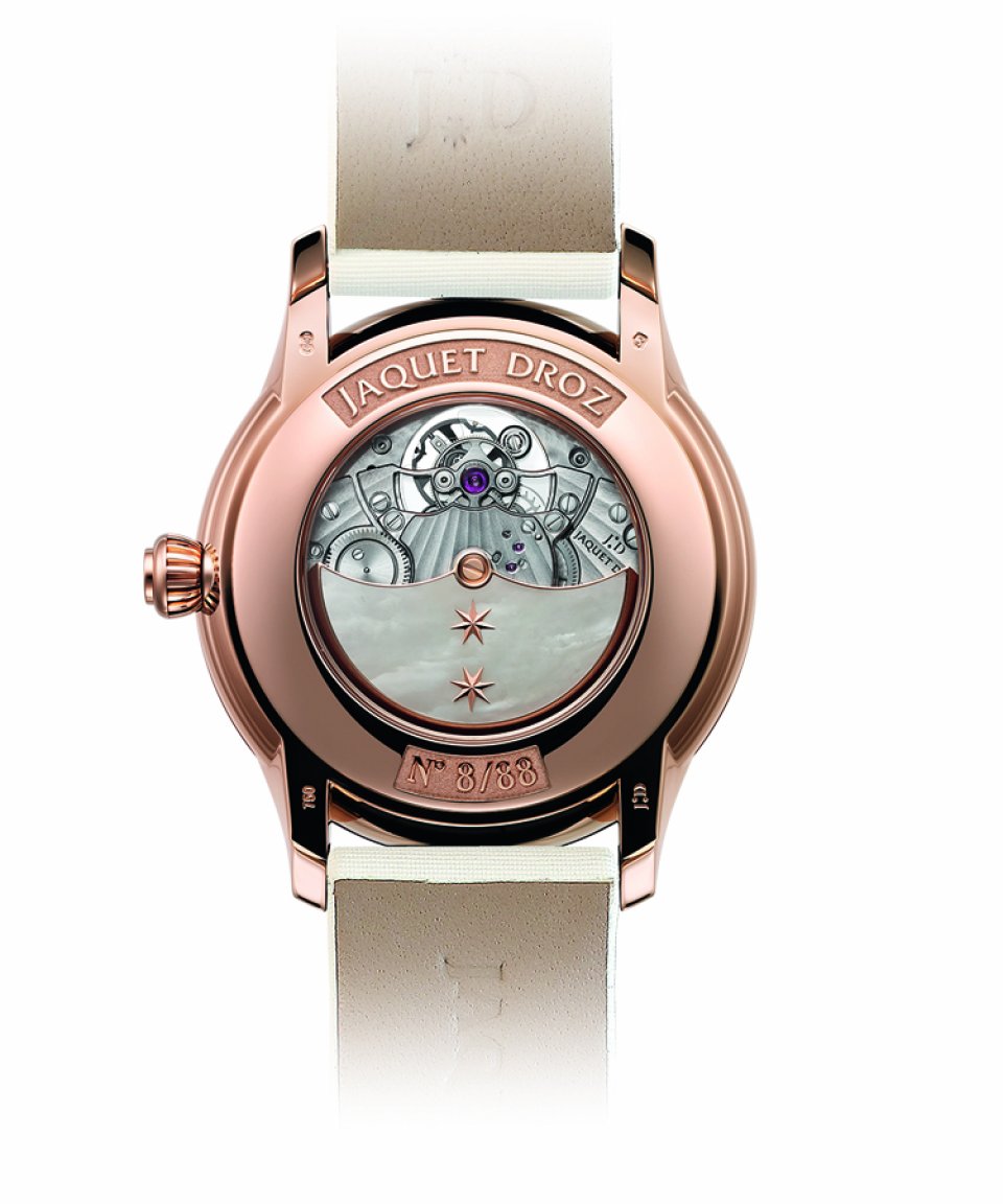 今日、ジャケ・ドローはこのアイコニックなシルエットに新たな解釈を施して、レディースウォッチの新しいデザインを描き出しています。そのために、職人たちは美しい光の作用を生み出すマザー オブ パールを採用しました。このもろく繊細な素材を割れないように加工するには並外れた器用さを必要としますが、ジャケ・ドローは天然石を文字盤に採用してきた長い歴史を通じて培った、多彩なノウハウを駆使して見事にマザーオブパールを文字盤へと仕上げています。キラキラと輝く効果が、ブリリアントカットダイヤモンドをあしらった、直径39mmの輝くレッドゴールドケースや、文字盤を彩るメタルリングやフォールディングバックルとコントラストを成しています。また時分表示に採用されたローマ数字のインデックスが、ブルースティールの針で際立つクラシシズムを演出しています。ホワイトサテンストラップを採用したグラン・セコンド トゥールビヨン マザー オブ パール(GRANDE SECONDE TOURBILLON MOTHER OF PEARL)は、ホワイトマザー オブ パールで装飾したゴールドローターや、扇状にコート・ド・ジュネーブ装飾を施したムーブメントのブリッジなど、独自の特徴を持っています。