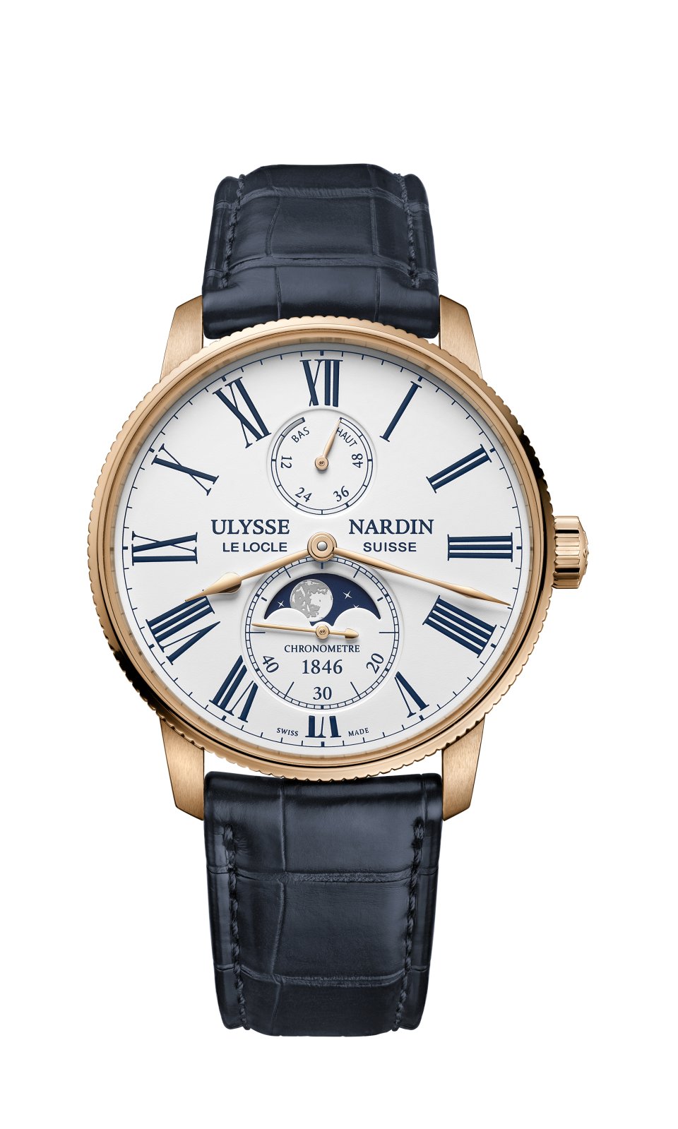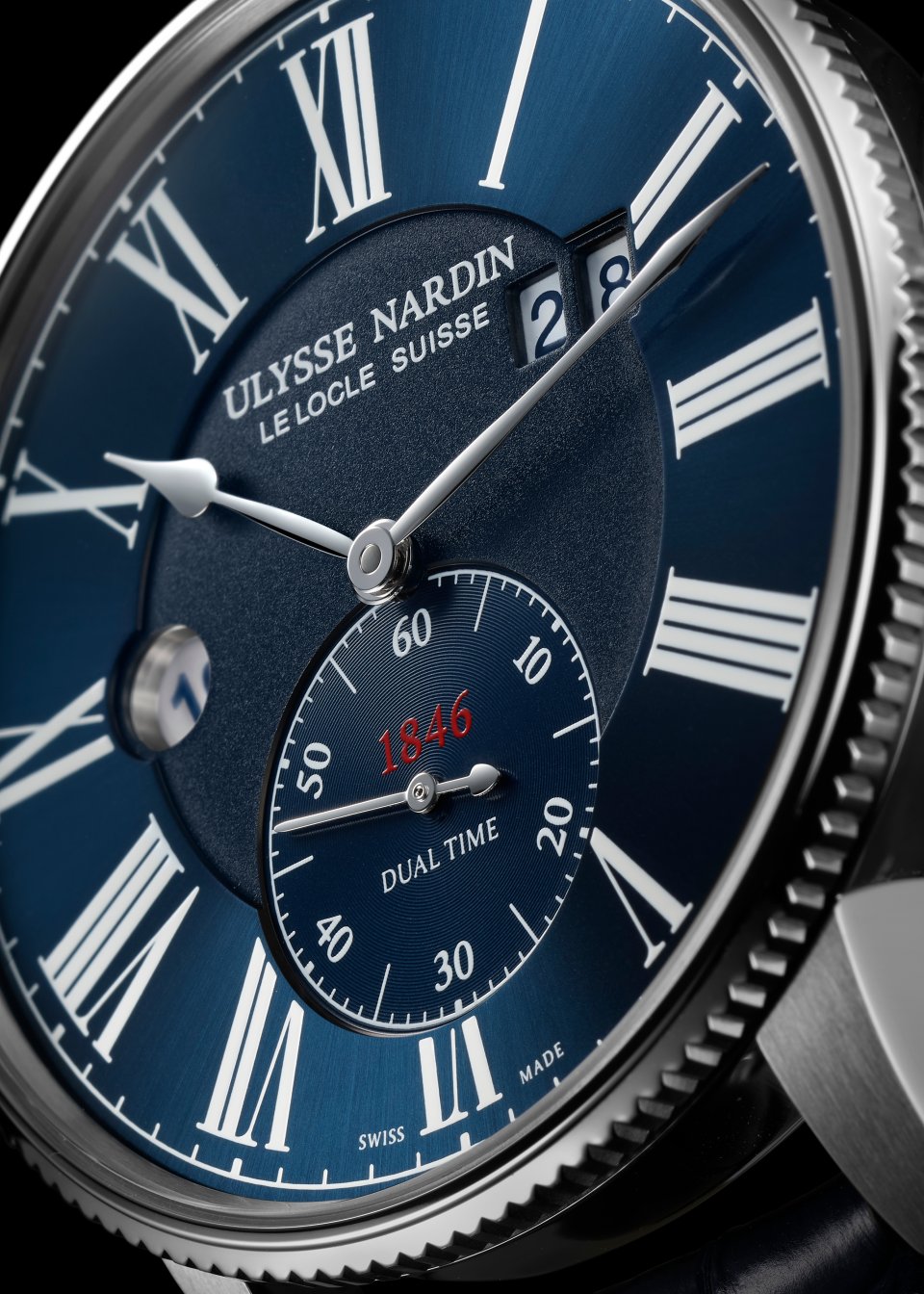 今年新しい「マリーン トルピユール デュアルタイム」は、自社製キャリバー UN 334の技術的に優れた点と、古のマリンクロノメーターの DNA フルーテッドベゼル、カウンター、ローマ数字インデックス を兼ね備えています。このムーブメントは時、分、6時位置にスモールセコンド、2時位置に前後に調整可能なラージデイトの日付窓を備えています。9時位置の小窓には24時間表示のホームタイム、8 時位置と10時位置の「 」 「-」プッシュボタンで短針で表すローカルタイムを簡単に調整できます。さらに、カレンダーはローカルタイムの前後方向に合わせ自動的に同期します。