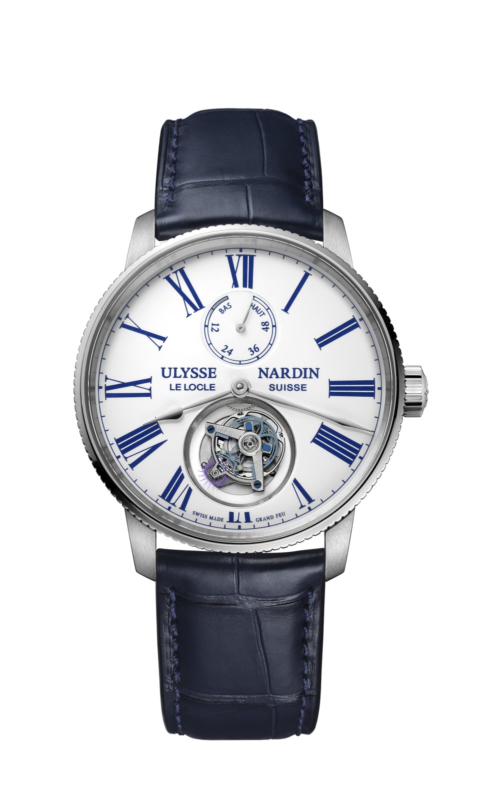 ドンツェ・カドランが制作したホワイトの「グラン・フー」エナメル文字盤は、12時位置にパワーリザーブを表示します。自動巻きマニュファクチュールキャリバー UN 128は、ユリス・ナルダンが特許を取得し、2015年の GPHGジュネーブ時計グランプリ でトゥールビヨンウォッチ賞を受賞したシリウム製アンクルとコンスタントエスケープメントのフライングトゥールビヨンを搭載しています。