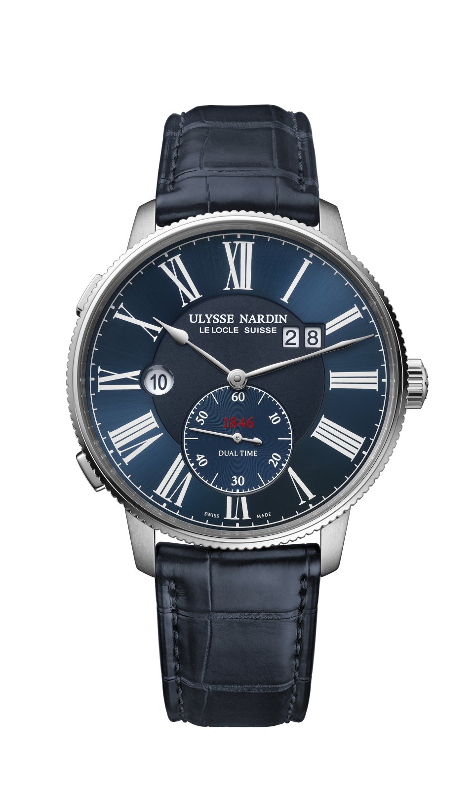 「マリーン トルピユール デュアルタイム」は、ポリッシュとサテン仕上げのステンレス スティール製ケースに、48時間のパワーリザーブ、50 m 防水、サンレイ&サテン仕上げのブルーダイヤルを備えています。このタイムピースには、スティール製フォールディング・バックルとブルーのアリゲーターストラップを標準に付属します。別売りのベルクロ式ファブリックストラップもにも付け替えることができます 。