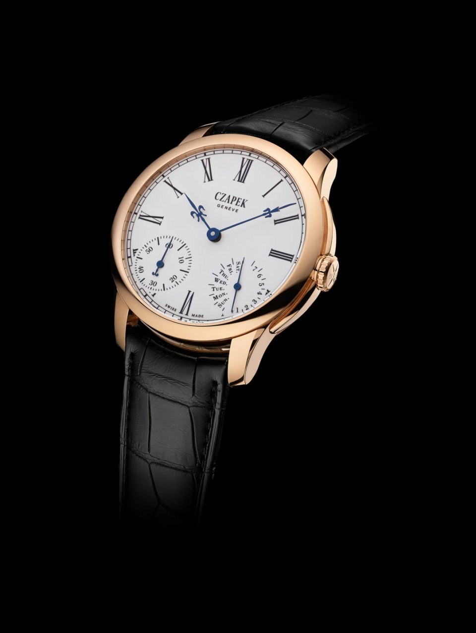 Czapek社は、Quai des Bergues 33bisの特徴を新たな視点で解釈したニューモデルを発表します。2016年のジュネーブ・ウォッチ・グランプリ(GPHG)でパブリック・プライズを獲得したこのモデルの主な特徴は、ダイアルが壮麗なグランフー・エナメル、ソリッドゴールド製で非常に細くて繊細な「フルール・ド・リス」スタイルの針、2つのサブダイアルは一方がスモールセコンド、他方がダブルハンドによるパワーリザーブと曜日表示。手巻きの自社製ムーブメント、キャリバーSXH1が搭載されています。