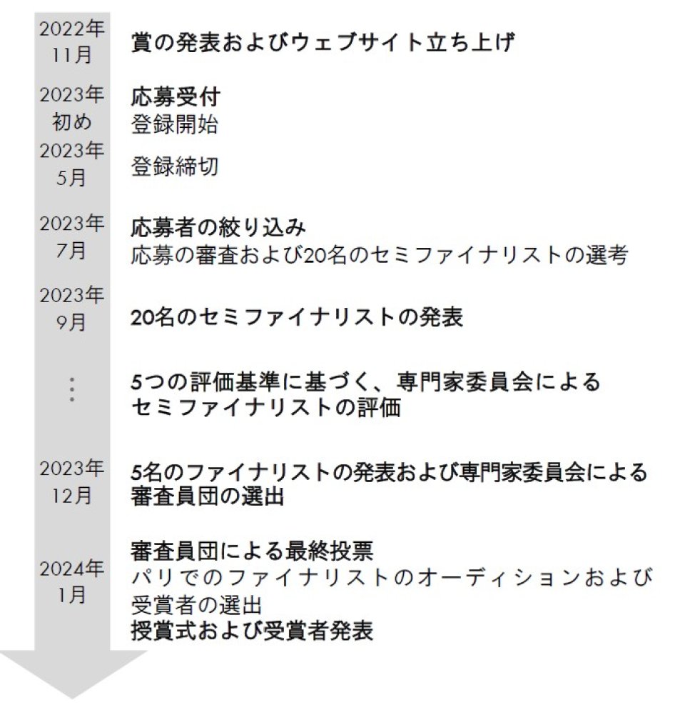 2023年12月に、専門家委員会は、「デザイン」、「クリエイティビティ」、「イノベーション」、「クラフツマンシップ」、「技術的複雑さ」という審査基準に基づいて5名のファイナリストを選出します。また、同委員会から5名の審査員団を指名し、最終審査を行います。