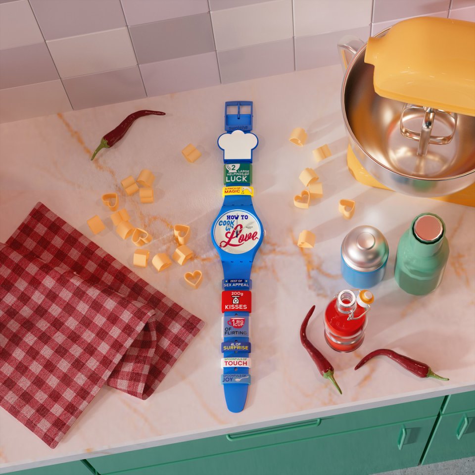 Swatch は、RECIPE FOR LOVEのパッケージ用に素敵なアイデアを焼き上げました。赤と白の格子状のボックスの裏側は、心が満ち足りた気持ちになるレシピになっています。「愛、魔法、イチャイチャ、信頼を注ぎます。 喜びをブレンドしたら、セクシーな魅力や柔らかなタッチも合わせます。最後に、キスを添えて完成です。一晩でも、一生でも、必要なだけ焼きます」。