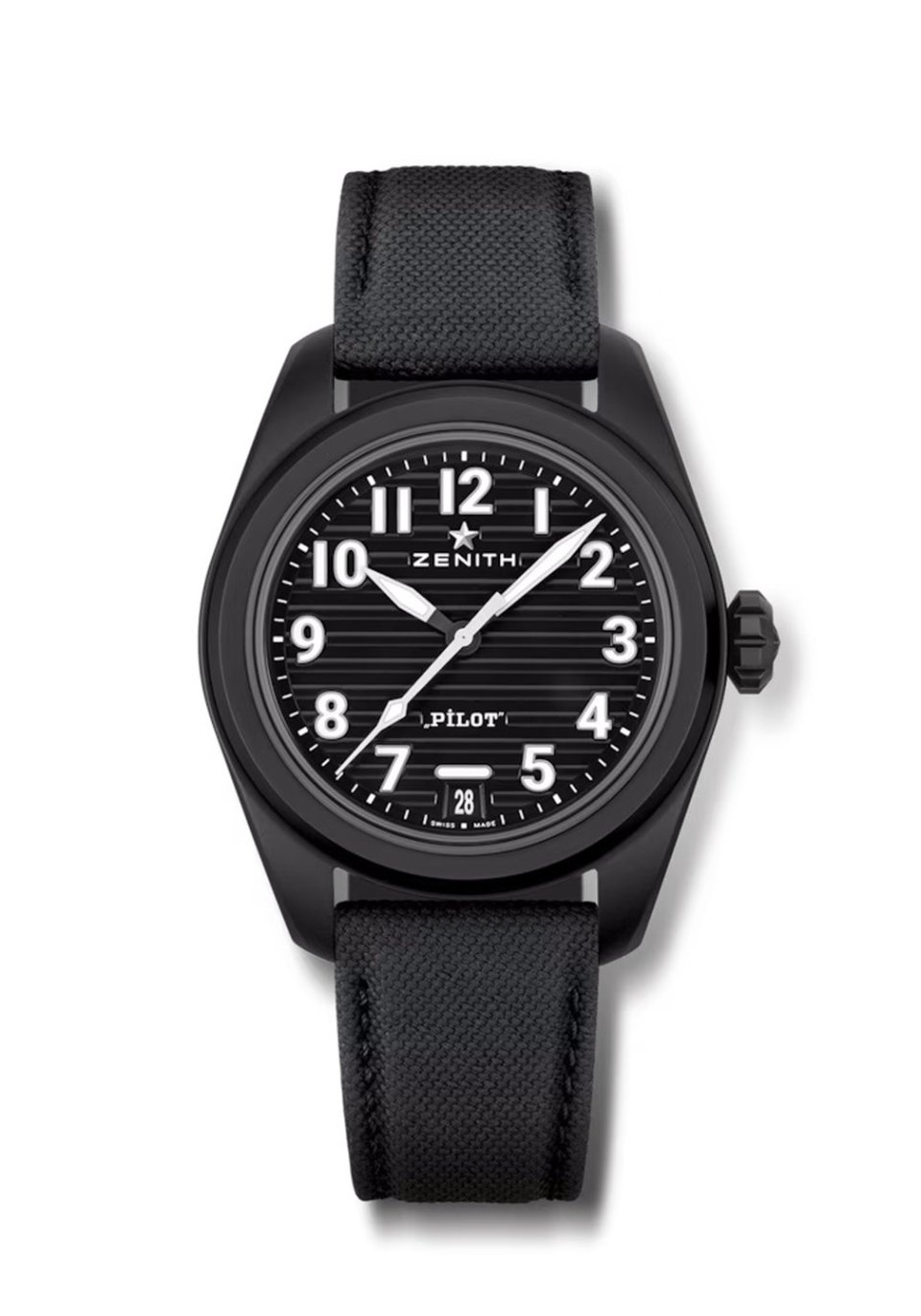 ゼニス パイロットウォッチの新世代モデルであるパイロット オートマティックは、コレクションの美的コードを振り返り、繊細なディテールが溢れる傑出したシルエットを実現しています。40mmのステンレススチール製またはブラックセラミック製ケースに収められたパイロット オートマティックは、全体的に新しいケースデザインが特徴的で、ラウンドケースの上には、固定されたフラットトップ ラウンド型ベゼルが採用されています。スチール製バージョンでは、表面に縦方向のサテンブラッシュド仕上げとポリッシュ仕上げの面取りが施されています。またブラックセラミック製バージョンでは、全体にマイクロブラスト仕上げが施され、さりげないマット仕上げになっています。パイロットウォッチの特徴である大型リューズは、よりモダンで角張ったフォルムとなっていますが、手袋をしたままでも行いやすい操作性はそのままです。