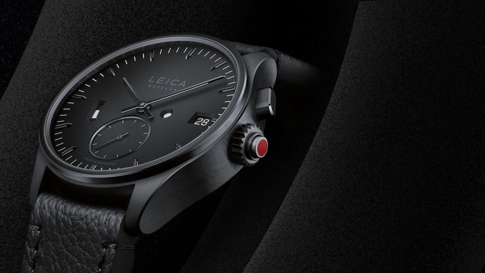 リューズ部分のレッドドット以外のカラーとシルバーのトーンを取り除き、ミニマルさを極めた美しいカラーリングは、ひときわ印象的なデザインに仕上げられています。反射防止コーティングを施したサファイアガラス製の風防の下には、ブラックのロジウムメッキ、ダイヤモンドカット、サンドブラスト加工を施したインデックスと針が配置されています。文字盤は、足も含めて高強度アルミニウムから削り出しており、耐衝撃性を高めています。ストラップの材質には、力強いグレイン(シボ)としっかりとした厚みを感じさせるブラックカラーのカーフレザーを採用。これは「ライカM11モノクローム」の外装レザーと同じ材質で、カットエッジ製法とハンドステッチ仕上げによって、堅牢さと洗練された質感を両立させています。