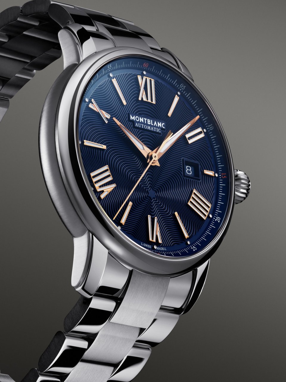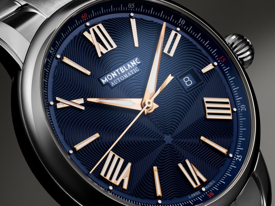 美しいブルーダイヤル、ローズゴールドコーティングの針とナンバーを備えたモンブランスターレガシーオートマティックデイトは、 38時間のパワーリザーブを備えた MB 24.17オートマティックムーブメントを搭載しており、時、分、秒と日付を表示します。このタイムピースは、 5分ごとのルミネセントの小さなドットと 15分ごとのオレンジで強調されたミニュトリーが、美しいカラーコントラストを生み出しています。