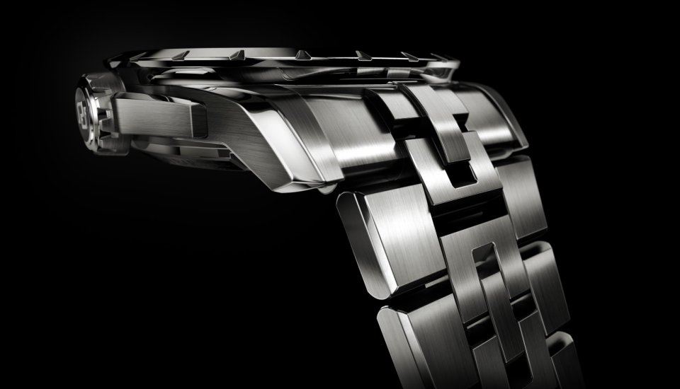 完璧なメタリック感を実現するために、ブレスレットにもチタンを採用しています。リンクの長さを短くすることで、手首への密着度を高めており、ごく僅かな調整で大きな変化をもたらしています。また、ブレスレット装着時の動きがさらに向上しており、これは特徴的なクイックリリース・システムを抜きにしては語れません。このシステムによって、着用するシーンを問わず快適で多様な使い方ができるようになりました。