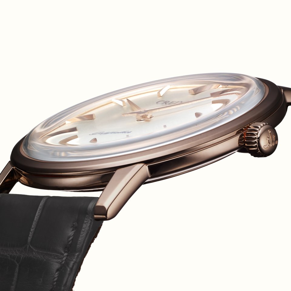 本作のケースは5つのデザインコンセプトに基づき、丸みを帯びた優美でおおらかな造形と、袖口に収まりやすい薄さの両立を図っています。さらに、ムーブメントをケースに直接固定し、裏ぶたのサイズを最小化する新構造を採用したことで、ケース裏側の斜面が広くなり、腕に着けた際、実際の厚さよりも薄く見えるデザインに仕上げています。また、細く軽やかなかん足とベゼルには、熟練の職人によって、それぞれザラツ研磨とダイヤカットが施され、繊細なシルエットを際立たせるように煌めきます。