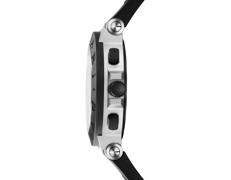 アルミニウム製のケース、高い耐久性と耐傷性を誇るDLC加工を施したチタン製ケースバック、ダブルロゴを配したブラックラバーベゼルが100m防水のこのタイムピースにスポーティな印象を加えています。
