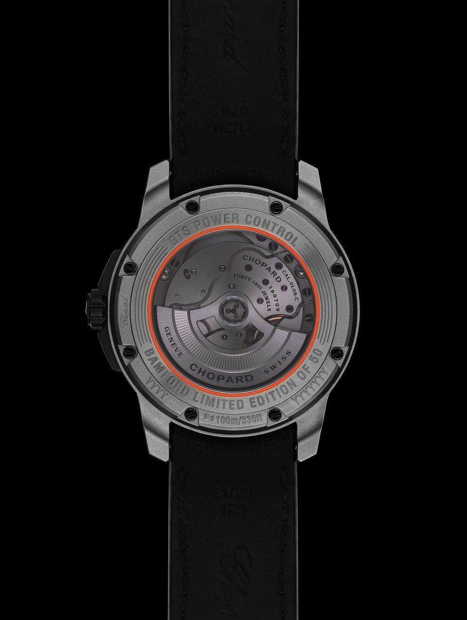 100mの防水性を保証するねじ留め式のケースバックは、PVDコーティングされた8本のブラックスクリューで固定されています。カラーの統一感を図るために、オレンジのパッキンで留められたティントクリスタルのシースルーケースバックからは、最高品質の仕上げと透かし彫りが施されたローターを備える自社製ムーブメントの姿を堪能できます。