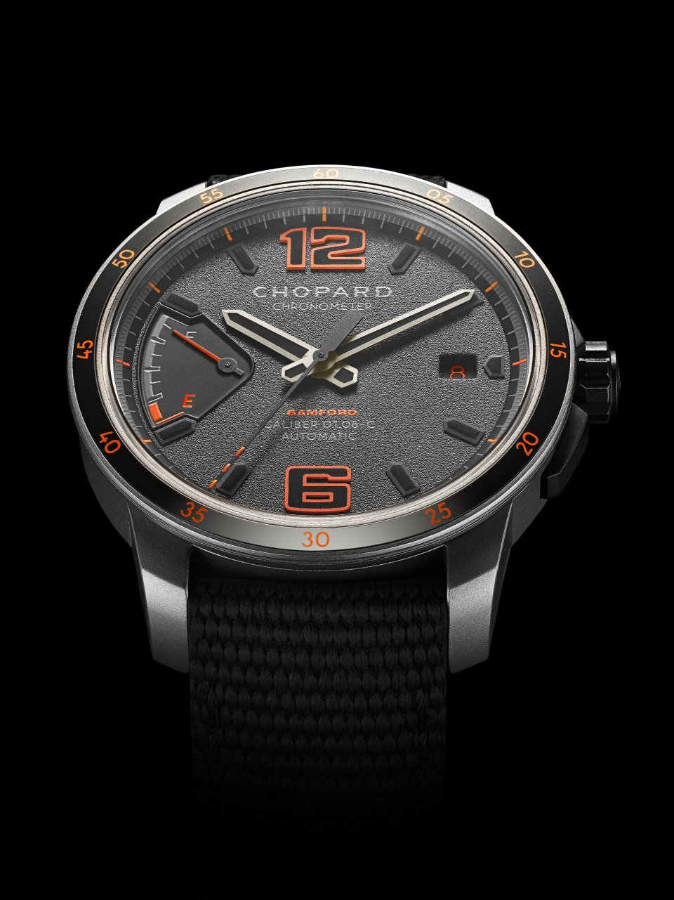 このスペシャルエディションのタイムピースは、グレーの基調カラーにコントラストを効かせて魅力的に仕上げられています。フロスティッドブラックの文字盤は、バンフォードウォッチデパートメントスタジオのシグネチャーカラーであるフレームオレンジのタッチが際立ちます。ブラックのスーパールミノバ®を塗布したラージサイズの「12」と「6」のアラビア数字が文字盤上で映え、モータースポーツにおける視認性基準を満たします。