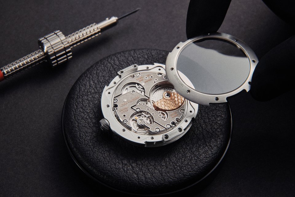 新たなキャリバーLFT023は、進化したタンブールを駆動するムーブメントであるだけでなく、モノグラム・フラワーを想わせるオープンワークの施された香箱カバーから、様式化された「LV」のモチーフを繰り返しあしらったマイクロローターまでメゾンのデザインコードをすべて体現するためにムーブメント専門メーカーのル・セルクル・デ・オルロジェ社と協力してルイ・ヴィトンが設計した、初の自社製自動巻き3針ムーブメントです。紛れもなく現代的なムーブメントであり、マイクロサンドブラスト仕上げのブリッジ、ポリッシュ仕上げのエッジ、ウォッチの他の部分の仕上げを踏襲した面取り加工を採用しています。サーキュラーグレインが施された地板は、伝統的なムーブメント装飾を踏まえていますが、従来のマゼンタ色のムーブメント用ルビーに代わる無色透明のサファイアは、キャリバーLFT023の前衛的なビジュアルアプローチを主張しています。マイクロローターは、高慣性の22Kゴールド製で、4HZ(28,000振動 / 時)の脱進機を搭載し、50時間のパワーリザーブを備えた香箱に並外れて効率的な巻き上げを提供するペリフェラルギアと組み合わされています。