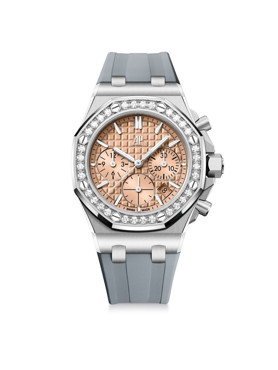 この最新のオーデマ ピゲ 37 mm ロイヤル オーク オフショア クロノグラフはジェムセット、新しい「レディタペストリー」ダイヤル、インターチェンジャブルストラップによりスタイルを一新しました。©オーデマ ピゲ提供