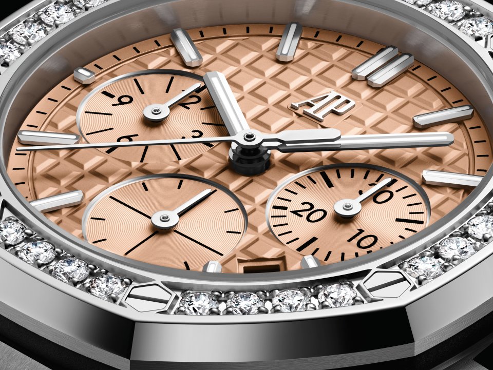 ダイヤルの「レディタペストリー」のピラミッドモチーフはこれまでよりやや大きくなっています。さらに、以前の37mm ダイヤルにあったスネイル仕上げのゾーンをなくし洗練度をアップ。そしてトランスファー印刷のオーデマ ピゲシグネチャーロゴに代わり、ウォッチに合わせたプロポーションのAP モノグラムロゴを採用。アワーマーカーをやや強調してスポーティな感じに仕上がっています。