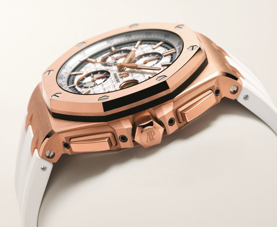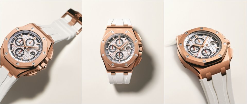一方で、18Kピンクゴールドのメンズモデルであるロイヤル オーク オフショア ・クロノグラフは、「メガ・タペストリー」模様のダイヤルにブルーで縁取られたインカウンターとピンクゴールド製の針とアワーマーカーが備えられています。