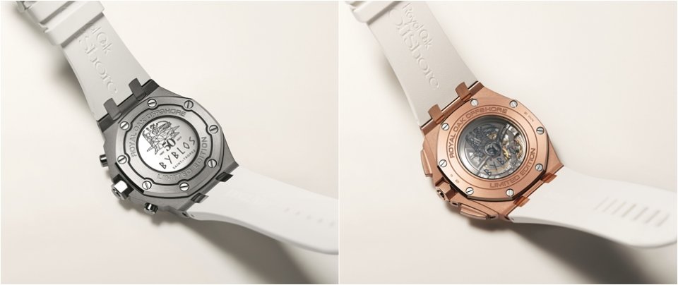 50周年記念のハイライトとして、ロイヤル オーク オフショア・サマーエディション2モデルのケースバックにはホテルの記念日と、ゼウスによるエウロペの誘拐を描いた紋章が刻印されています。