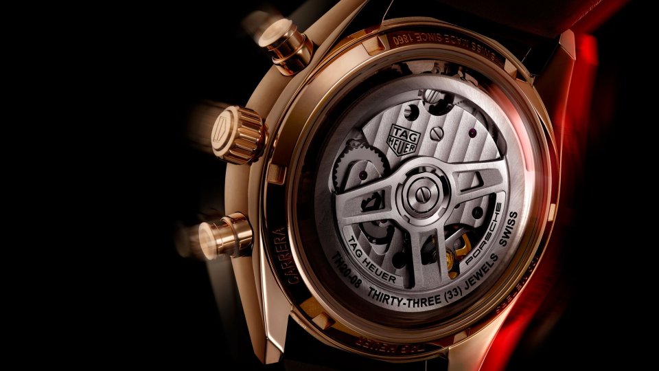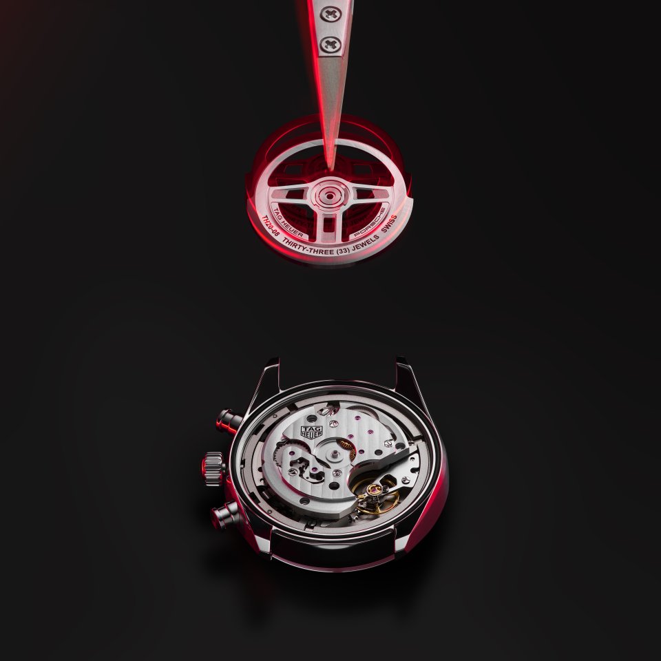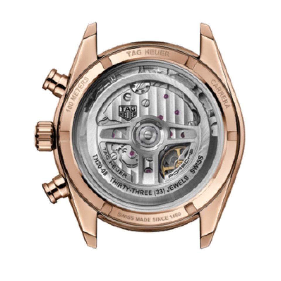 タグ・ホイヤー カレラでは初のこの革新的なデザインは、前面のガラスからの視認性を高めるとともに、ケースバックのガラスから心を虜にされるようなウォッチの精緻な機構が鑑賞できます。ケースバックでは、ポルシェのアイコニックな3本スポークを再現した特別設計のローターを見ることができます。