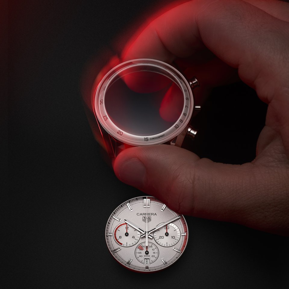 さらにうれしいサプライズとして、「タグ・ホイヤー カレラ クロノスプリント x ポルシェ」が開拓する新次元のイノベーション、ダブルグラスボックスも採用されています。「グラスボックス」と呼ばれるのは、それがドームのように弧を描くクリスタルガラスでできているからで、これは1970年代にあった、同様のドーム型のヘサライトクリスタルへのオマージュです。タキメーターの目盛りの上を、自然にカーブを描くように再設計されたグラスボックスは、ダイヤルの端まで伸び、ケースと一体になります。