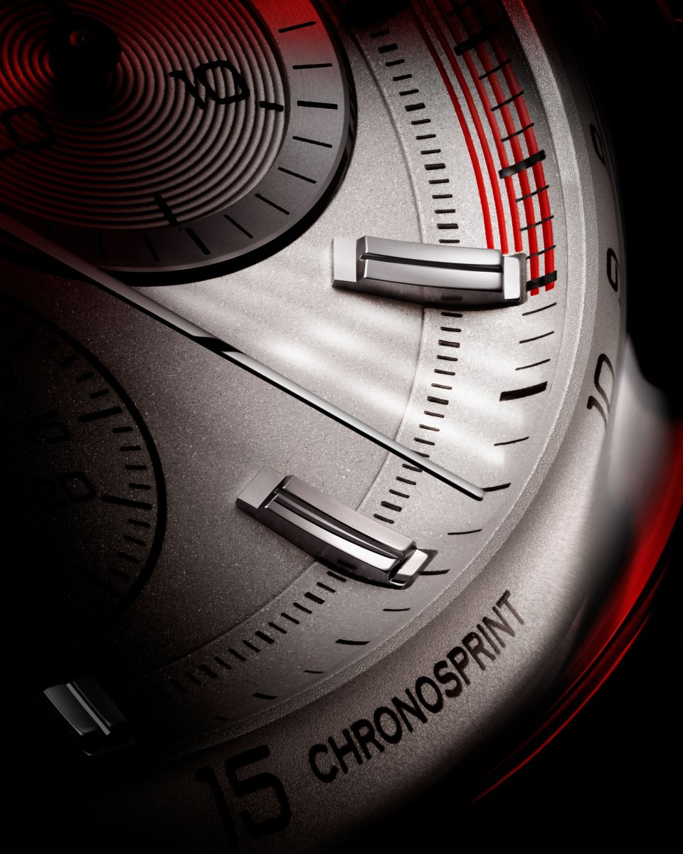 ほかにもウォッチのいたるところに加えられた赤のディテールが、自動車の世界からのインスピレーションを感じさせます。6時位置のサブダイヤルは、都市部で推奨されていた時速50km周辺を目立つように示していた、1970年代のポルシェのアイコニックなダッシュボードを思わせます。