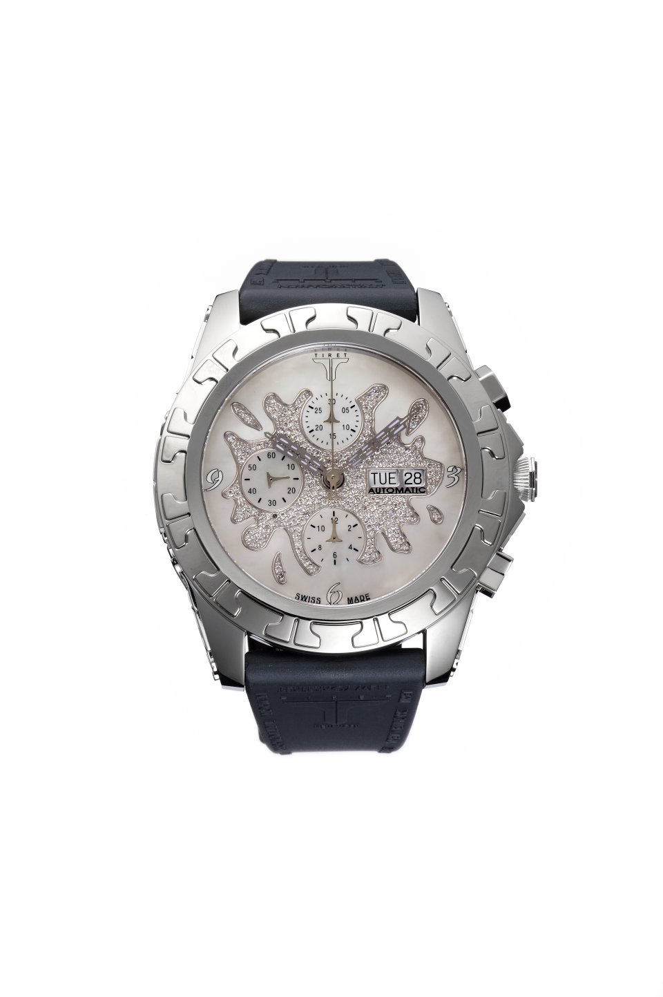 ブランドを代表するコレクション、オートマティッククロノグラフの特徴のひとつは、クルクルと回して取り外し可能なベゼルです。ご自身でプレーンなベゼルとダイヤモンドベゼルなど、シーンに合わせて付け替えができる、他にはないユニークなシステムです。ストラップも、ラグの裏にあるツメを操作することによりワンタッチで交換可能なため、気分や天候に合わせ、レザーやラバー、色違いなど、ユーザーがTPOに合わせて自分で着せ替えることができる、まるで、ワンオフのように楽しむことができる仕様になっています。
