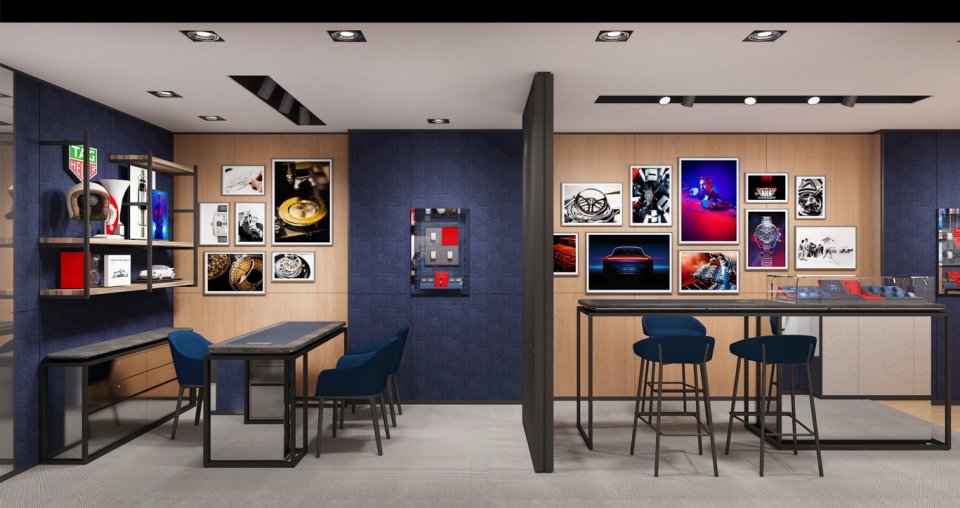2階建ての広いブティックは124 sqmの売り場面積を誇り、最新のコレクションや限定モデル、アイコンコレクションである「タグ・ホイヤー カレラ」や「モナコ」、「アクアレーサー」や人気のモデル「TAG Heuer Connected」など幅広く取り揃えています。