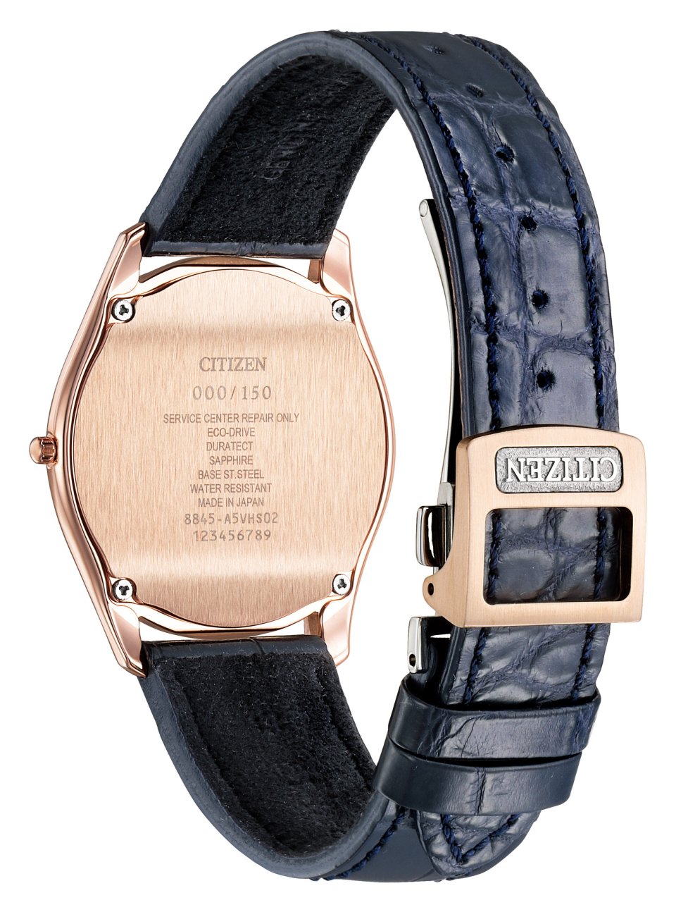 ケース素材のステンレスにはシチズン独⾃の表⾯硬化技術デュラテクト[※3]を施しており、耐傷性にも優れています。裏ぶたにはリミテッドエディションナンバーを刻印しています。