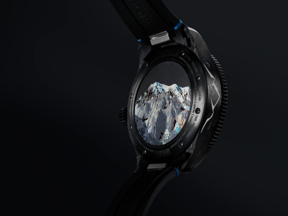 冒険のテーマを強調するために、43.5mm チタニウムおよび CARBO2 ケースの側面には、タイムピースを着用する人だけが見ることができる、モンブラン山の輝く青い輪郭を彫刻しています。グレイシャーは経年により、含まれる酸素が減少して密度が増し、さらに濃いブルーになります。ケースバンドにはそれが現れ、昼間は白く輝き、夜は明るいブルーに光ります。このような効果を実現するために、スーパールミノバ®と保護ワニスの層を丁寧に手作業で施しています。チタニウムのケースバックには、モンブランの 3D レーザー手法を使用して、この驚異的な自然の色、深み、リアリズムを捉えたモンブラン山のイメージを装飾しています。