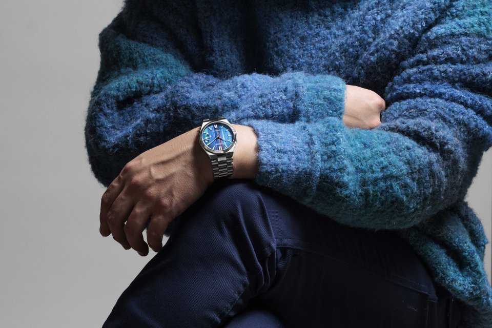 文字板は、爽やかなターコイズブルーとブルーを基調としたグラデーションの2 色展開で、インデックスの斜面部分と切分(1 分刻みの目盛り)にカラー印刷を施して、限定モデルらしい特別なカラーリングに仕上げました。
