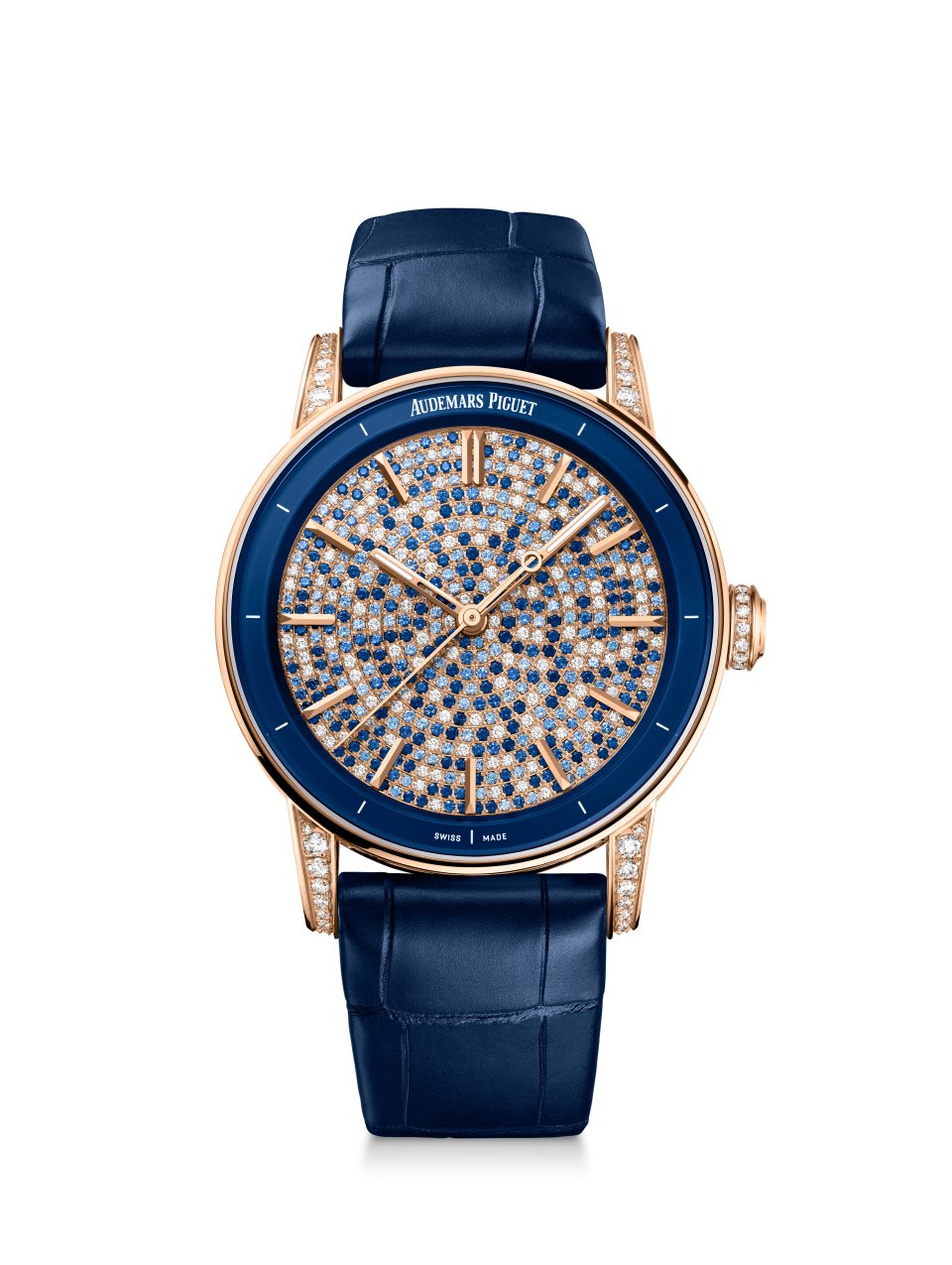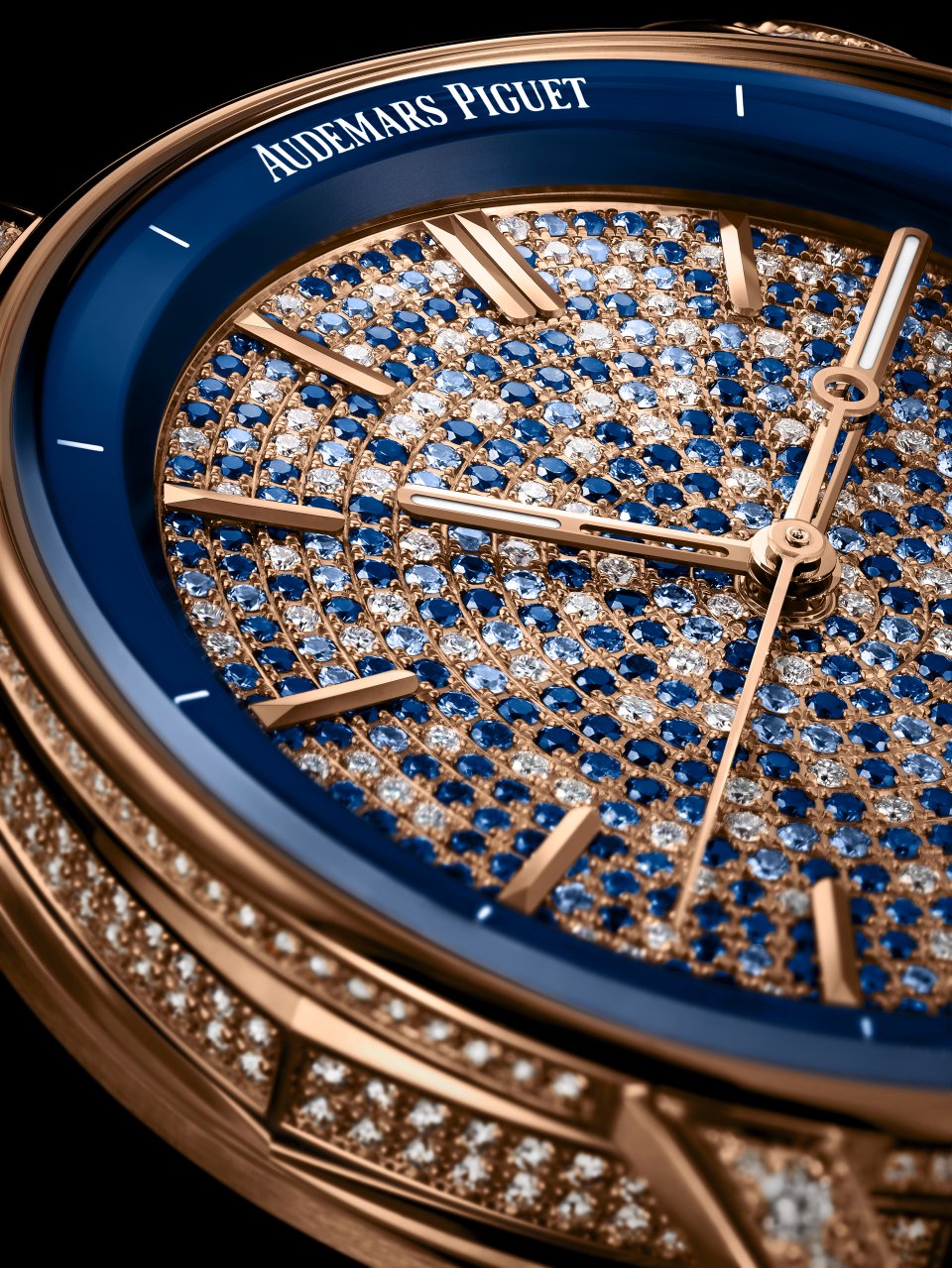 38mmの「CODE 11.59 バイオーデマピゲ」コレクションでは初めて、ミドルケース、ラグ、リューズにブリリアントカットダイヤモンドをフルセッティングしたエレガントに輝くモデルです。