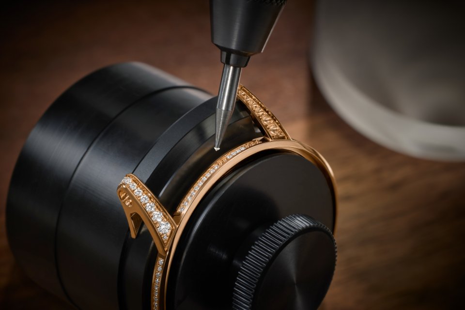 しかし、美しさという点ではダイヤルが主役です。ゴールドケースにフルセットされているのは、選び抜かれた134個のダイヤモンドと399個のサファイア(約2.05カラット)。ブルーまたはピンクのグラデーションカラーで、手首を動かすたびに光を捉えて美しく輝きます。ブリリアントカットのジェムストーンは2種類のサイズにカットされています。一つは0.85mmから0.90mm、もう一つは0.90mmから1mmのサイズで、そこから生まれるイレギュラーな効果の中にカラーが調和し、タイムピースを魅力的に仕上げています。