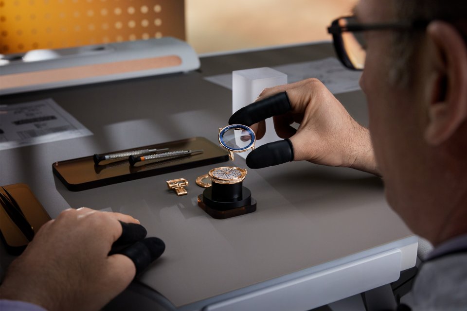 製造プロセスの中でジェムストーンの調達は重要です。求めるグラデーションのカラーで、しかも十分な量がなければなりません。見事なビジュアル効果を発揮するダイヤルにストーンをセットする作業と同じぐらい、ストーンの調達は大切なものなのです。