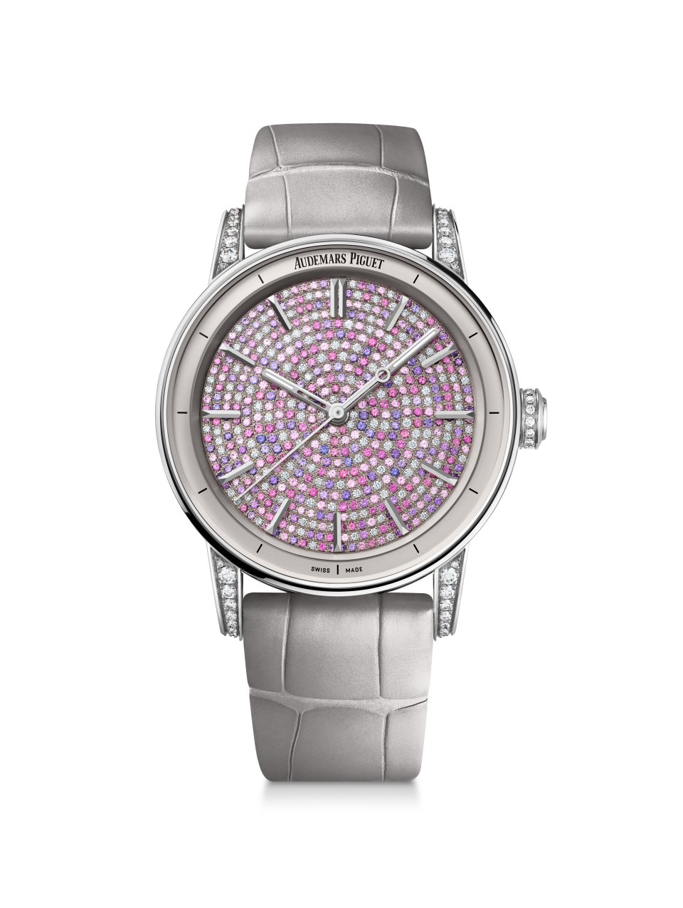 18Kピンクゴールドまたはホワイトゴールドの「CODE 11.59 バイ オーデマ ピゲ」の新モデルは、ダイヤモンドとカラーサファイアをイレギュラーセットしたまばゆいダイヤルを備えています。©オーデマ ピゲ提供