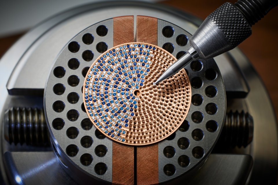 ダイヤル:ダイヤルに533個のブリリアントカットグラデーション ブルーサファイア(約1.64カラット)とダイヤモンド(約0.41カラット)をセット