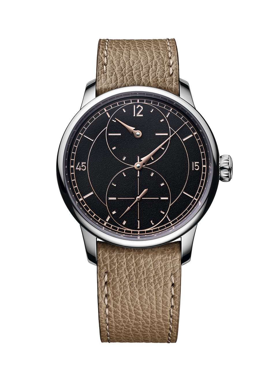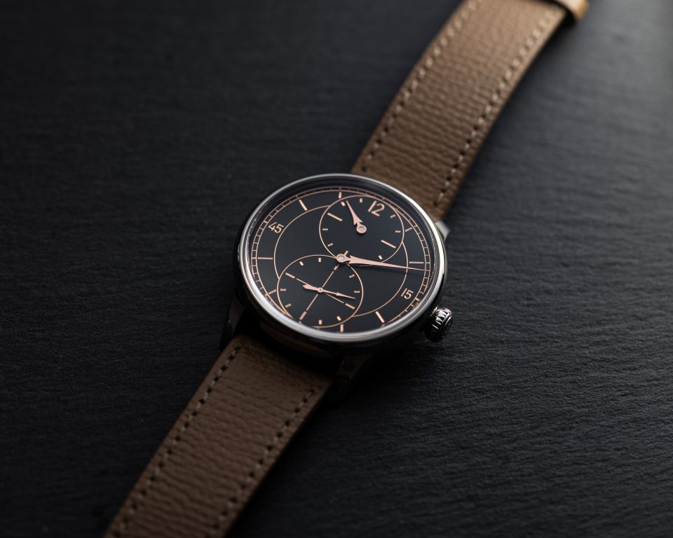 「レギュレーター グラヴェ ノワール」は39mmサイズで、ポリッシュ仕上げのスチールケースに5Nローズゴールドのディテールが施されています。